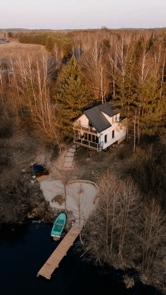 Z jednej strony masz widok na las, z drugiej – na prywatny staw, który o poranku spowija mgła, a wieczorem odbija płomienie zachodzącego słońca. Gdy siedzisz z kubkiem herbaty na drewnianym tarasie, świat na chwilę przestaje się spieszyć.